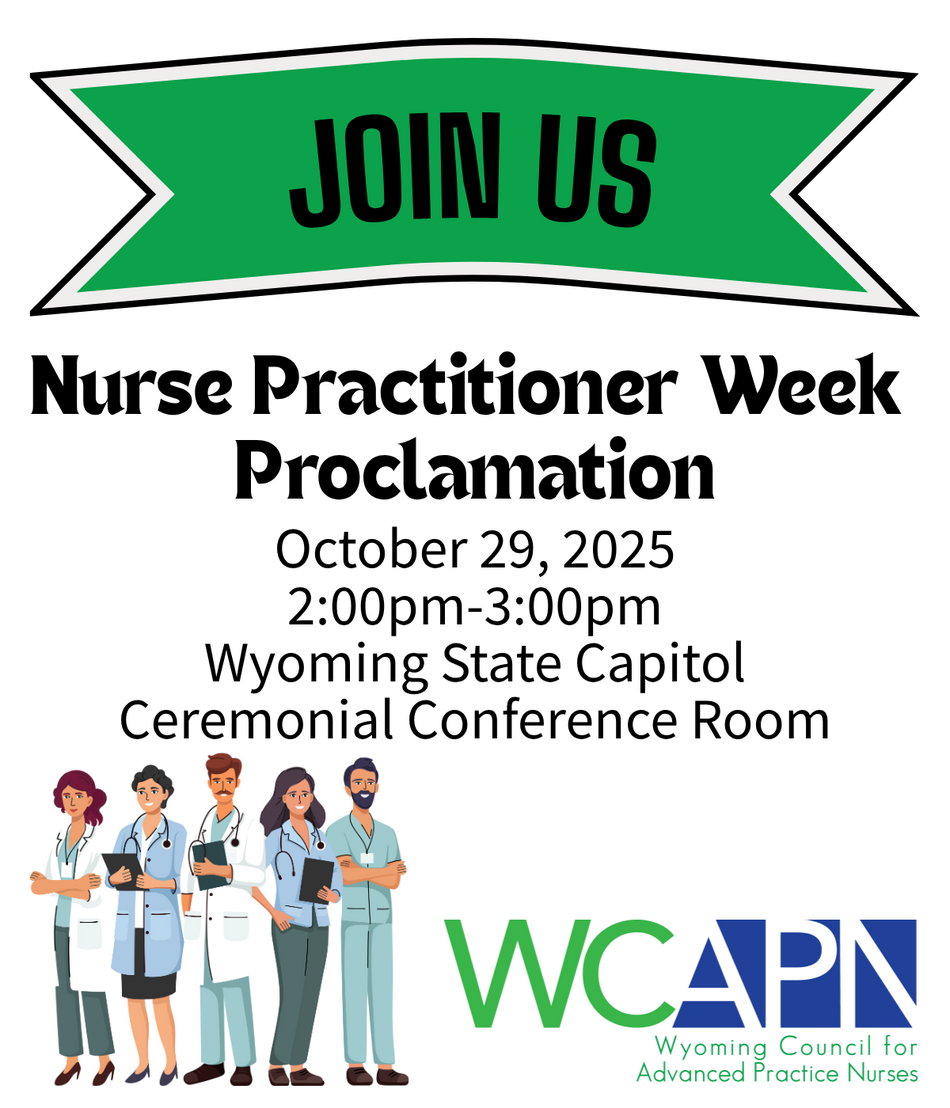 Wyoming's Governor Mark Gordon will be publicly signing the 2025 Nurse Practitioner Week Proclamation at the Capital. All nurse practitioners are invited to join us at the signing that will be held in the Ceremonial Conference Room on October 29th at 2:00pm.
